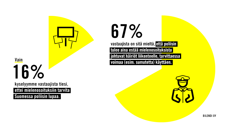 Bilendi Oy:n kyselytutkimuksessa kohderyhmänä oli 18–75-vuotiaat suomalaiset. Kyselyyn vastasi verkossa 1000 henkilöä. Otos kiintiöitiin kansallisesti edustavaksi sukupuolen, iän ja asuinalueen mukaan. Tutkimuksessa selvitettiin miten suomalaiset suhtautuvat mielenosoituksiin ja kuinka hyvin suomalaiset tuntevat kokoontumisvapauteen liittyvää lainsäädäntöä.
