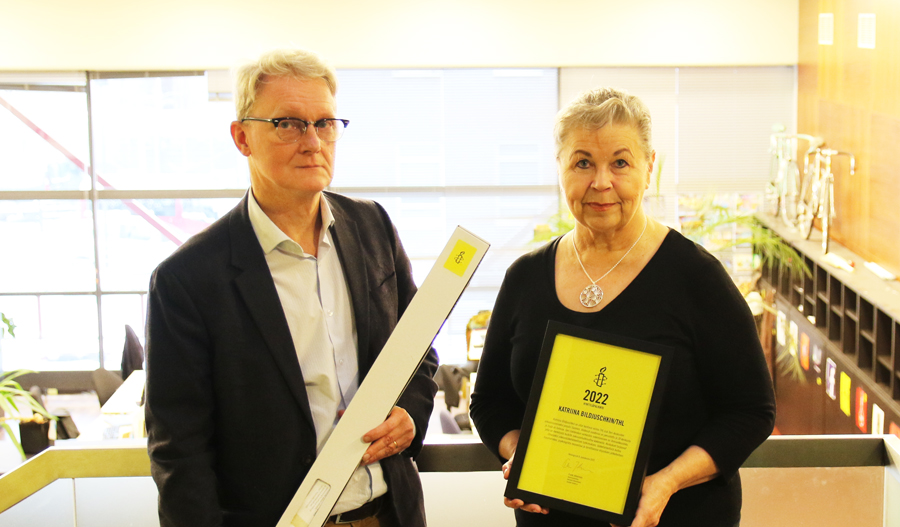 Amnesty Internationalin Suomen osasto myöntää vuoden 2022 Kynttiläpalkinnon erityisasiantuntija Katriina Bildjuschkinille. Bildjuschkinin työ Seri-tukikeskustyön asiantuntijana ja verkoston rakentajana on ihmisoikeusteko, jolla on merkitystä seksuaaliväkivaltaa kokeneiden toipumiselle.