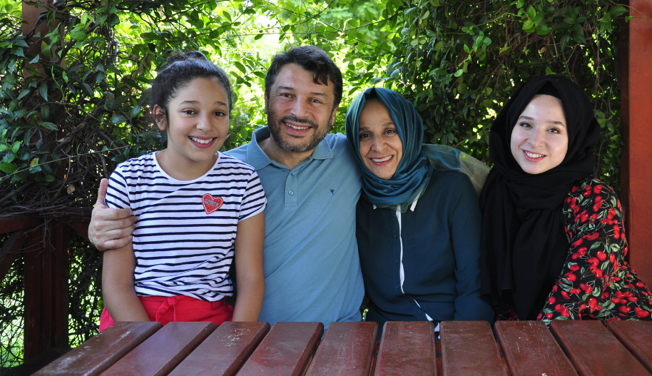 Kuvateksti: Ihmisoikeuspuolustaja Taner Kılıç halaa vaimoaan ja tyttäriään vapauduttuaan vankilasta takuita vastaan vuonna 2018.