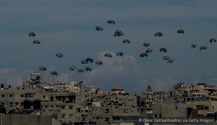 Valtiot ovat viime aikoina lisänneet avun toimittamista Gazaan ilmapudotuksilla. Humanitaarisen avun ammattilaiset kuitenkin korostavat, että pelkästään tällä menetelmällä ei voida mitenkään vastata alueen valtaviin tarpeisiin. Katastrofaalisessa tilanteessa elävää 2,3 miljoonaa ihmistä ei voida ruokkia ja hoitaa ilmapudotuksilla.