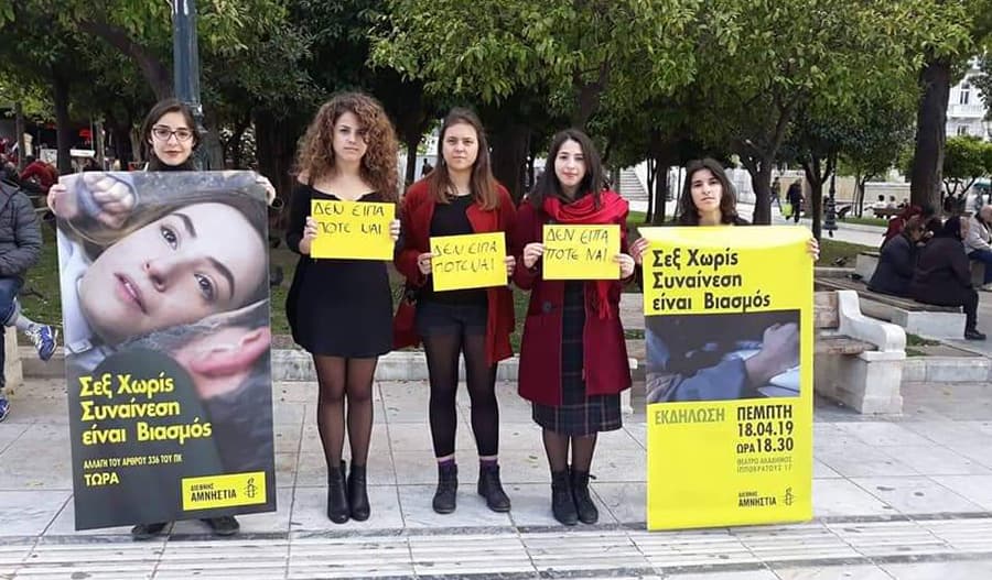 Maaliskuu 2019: Kreikan hallitus käynnistää kuulemisen rikoslain uudistamisesta. Amnesty jättää lausunnon raiskauksen määritelmän ankkuroimisesta suostumuksen puutteeseen ja järjestää tähän liittyen lehdistötilaisuuden. Amnesty on asiasta yhteydessä myös YK:n asiantuntijatyöryhmään, joka käsittelee naisiin ja tyttöihin kohdistuvan syrjinnän torjumista.