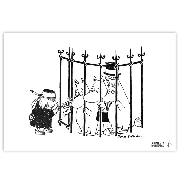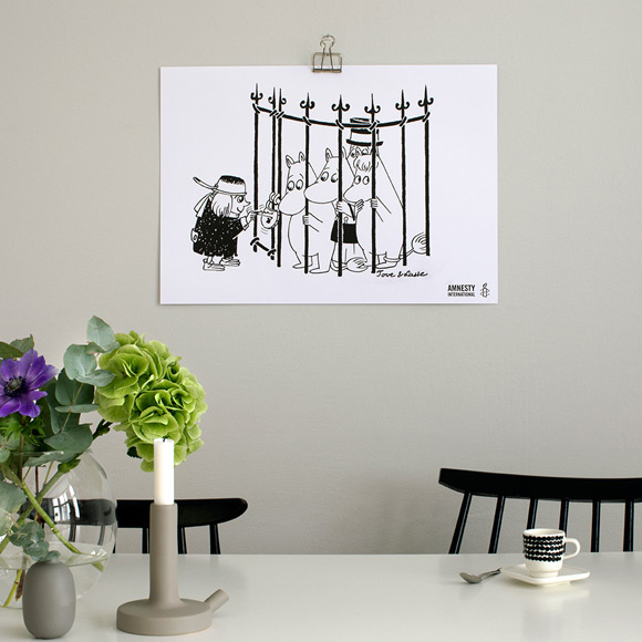 Olemme saaneet myyntiin upeita Muumi-julisteita! Tove ja Lars Jansson suunnittelivat julisteen 1980-luvun alussa Suomen Amnestyn ruotsinkieliselle paikallisryhmälle, joka kampanjoi mielipidevankien vapauttamiseksi.